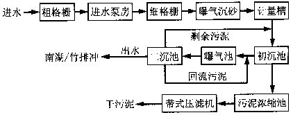 從(cong)廠外污(wu)(wu)(wu)水(shui)(shui)干管(guan)收集到瑯東(dong)污(wu)(wu)(wu)水(shui)(shui)處(chu)理(li)(li)廠的(de)(de)污(wu)(wu)(wu)水(shui)(shui),首(shou)先進(jin)(jin)行預處(chu)理(li)(li)。在(zai)進(jin)(jin)水(shui)(shui)泵房經過粗(cu)格(ge)柵,去除污(wu)(wu)(wu)水(shui)(shui)中較大的(de)(de)垃圾、漂浮物(wu)(wu)(wu);通過5臺(tai)大型污(wu)(wu)(wu)水(shui)(shui)泵將污(wu)(wu)(wu)水(shui)(shui)提升到細(xi)格(ge)柵,將較小(xiao)的(de)(de)漂浮物(wu)(wu)(wu)去除;在(zai)曝氣(qi)沉(chen)(chen)(chen)砂池(chi)(chi)去除污(wu)(wu)(wu)水(shui)(shui)中的(de)(de)砂粒和(he)油類;然后進(jin)(jin)入計量槽,計量污(wu)(wu)(wu)水(shui)(shui)處(chu)理(li)(li)量。預處(chu)理(li)(li)后的(de)(de)污(wu)(wu)(wu)水(shui)(shui)在(zai)初沉(chen)(chen)(chen)池(chi)(chi)進(jin)(jin)行一級處(chu)理(li)(li),去除約(yue)30%的(de)(de)有(you)機(ji)物(wu)(wu)(wu);初沉(chen)(chen)(chen)池(chi)(chi)出(chu)水(shui)(shui)進(jin)(jin)入二級處(chu)理(li)(li),先在(zai)生物(wu)(wu)(wu)處(chu)理(li)(li)工藝的(de)(de)核(he)心部(bu)(bu)分--曝氣(qi)池(chi)(chi),進(jin)(jin)行生物(wu)(wu)(wu)降解有(you)機(ji)物(wu)(wu)(wu);曝氣(qi)池(chi)(chi)的(de)(de)混(hun)合液輸送到二沉(chen)(chen)(chen)池(chi)(chi)進(jin)(jin)行沉(chen)(chen)(chen)淀,泥(ni)水(shui)(shui)分離(li)。上層澄(cheng)清液作為凈化后的(de)(de)清潔排放水(shui)(shui);沉(chen)(chen)(chen)淀下來的(de)(de)污(wu)(wu)(wu)泥(ni)一部(bu)(bu)分回(hui)流(liu)曝氣(qi)池(chi)(chi)后再(zai)生利用,一部(bu)(bu)分作為剩余(yu)污(wu)(wu)(wu)泥(ni)回(hui)流(liu)到初沉(chen)(chen)(chen)池(chi)(chi)。初沉(chen)(chen)(chen)池(chi)(chi)的(de)(de)污(wu)(wu)(wu)泥(ni)用泵輸送到污(wu)(wu)(wu)泥(ni)濃縮池(chi)(chi),進(jin)(jin)一步濃縮池(chi)(chi),通過污(wu)(wu)(wu)泥(ni)處(chu)理(li)(li)系統,把泥(ni)漿態(tai)的(de)(de)污(wu)(wu)(wu)泥(ni)脫水(shui)(shui)、壓濾,形成(cheng)干污(wu)(wu)(wu)泥(ni)餅(bing)。工藝流(liu)程見圖1。