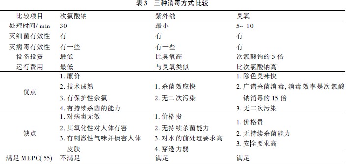 紫外線消毒無二次污染的擔憂, 但是紫外線燈管罩易結垢, 隨著時間的推移, 勢必影響燈光的強度, 影響殺菌的效果。污水處理系統運行過程中需對紫外線燈管罩進行定期的清除污垢。臭氧消毒反應快、投量少、適應能力強、消毒性能穩定, 無二次污染。表3 為三種消毒方式的比較。