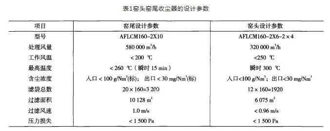 QL公司2500t/d預分解窯(yao)(yao)水泥生產線窯(yao)(yao)頭窯(yao)(yao)尾收塵(chen)器的(de)設計(ji)參數見表1,自(zi)2010年3月投(tou)入運(yun)行后,運(yun)行中(zhong)存在的(de)問題如下。