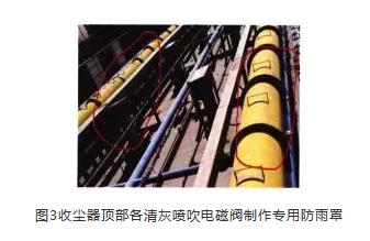 (5)為收塵器(qi)頂部各清灰噴吹電磁(ci)閥制(zhi)作專用(yong)防(fang)(fang)雨罩(如(ru)圖3所示),既(ji)延(yan)長了(le)其使(shi)用(yong)壽命,也防(fang)(fang)止雨水進人造成電氣元(yuan)件短路(lu)。