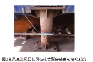 (4)在各(ge)風(feng)(feng)室(shi)進風(feng)(feng)口(kou)擋(dang)風(feng)(feng)板處管道安裝自制噴(pen)(pen)吹系統,用(yong)電磁閥控(kong)制每小時噴(pen)(pen)吹一次,防止此處因積灰影響(xiang)系統通風(feng)(feng)(見圖2)。