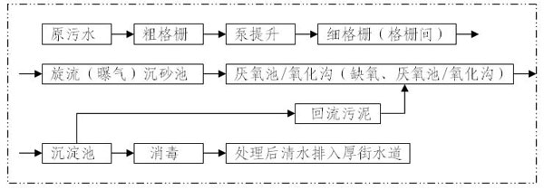 一期工程污水處理采用厭氧-氧化溝工藝,主要流程如下: