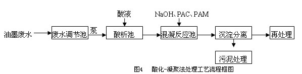 我們在工程實踐中根據油墨廢水的特點,并結合國內的實際情況,考慮到處理工藝的實際可行性,結合對不同廠家的油墨廢水小試的結果,主要采用酸析——凝聚法來處理油墨廢水,并在工程實踐中對工藝進行了改進和完善,我們先后采用了四種處理工藝:
