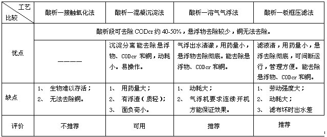 以上四種工藝我們先后應用于不同工程中,酸析單元主要去除大部分的菲林類物質,酸析除渣后廢水懸浮物仍很高,CODcr去除率僅40-50%,還需進一步凝聚分離除CODcr、SS和銅等,根據工程實踐經驗,以下對四種工藝優劣點進行比較。
