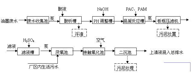 ③、 油墨廢水中含有COD、SS和銅等污染物,油墨廢水處理工藝應考慮這幾種污染物的去除,酸析可去除COD,混凝可去除銅,以避免銅對生物的毒害作用。經酸析和混凝后,COD仍很高,采用生化法深度處理,因BOD/COD值太低(<0.2),需適當加入有機物和營養鹽,工程中可考慮引入廠區的生活廢水,以提高油墨廢水的可生化性。