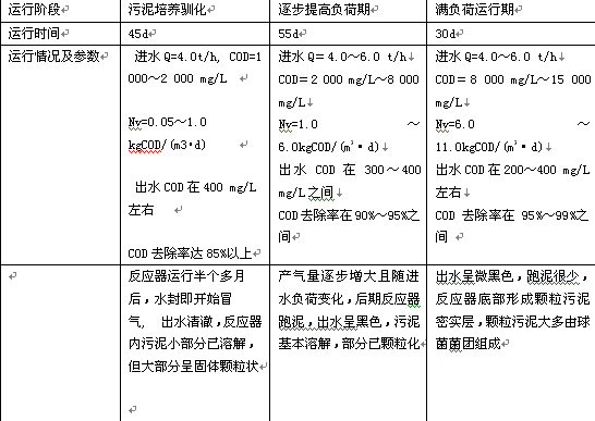 約45 d以后系統開始連續進水,并逐步提高進水負荷。這一階段依靠增加進水流量和濃度來提高進水負荷。由于企業生產量增加,進水流量由4 t/h提高至6 t/h,進水COD由2 000 mg/L提高至8 000 mg/L。經過兩個月左右的運行,反應器的負荷達設計要求,并且有很大的潛力。反應器內的污泥先由原來小顆粒狀的固體污泥溶解成絮狀,并逐步變成密實、表面有光澤的顆粒污泥,污泥性質發生了明顯的變化。由此,反應器具備了一定的抗沖擊負荷的能力,轉入滿負荷運行階段。