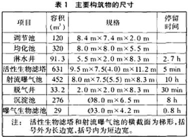為防止沉淀池中未絮凝的生物碎片漂出而造成出水水質的波動,采用曝氣生物濾池(以多孑L材料作濾層)進行后續處理。主要構筑物的尺寸及參數見表1。