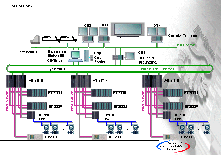 上位(wei)機采用客戶機/服(fu)務(wu)器(qi)方式。系統配置ES工程師(shi)站(zhan)一(yi)臺(tai)(tai)(tai),兼作(zuo)OS SERVER。操(cao) 作(zuo)員(yuan)站(zhan)OS 4臺(tai)(tai)(tai),其中(zhong)1臺(tai)(tai)(tai)OS站(zhan)為(wei)冗(rong)余(yu)的(de)(de)(de)SERVER站(zhan),另三臺(tai)(tai)(tai)為(wei)CLIENT站(zhan)。其中(zhong)兩臺(tai)(tai)(tai)OS站(zhan)帶雙屏(ping)顯示(shi),一(yi)臺(tai)(tai)(tai)OS站(zhan)帶大屏(ping)幕顯示(shi)。所有(you)的(de)(de)(de)操(cao)作(zuo)員(yuan)站(zhan)可(ke)以相互(hu)備用。ES 站(zhan)配置磁(ci)(ci)卡(ka)閱讀(du)機,以磁(ci)(ci)卡(ka)識(shi)別登錄(lu)工程師(shi)環境。配置打印服(fu)務(wu)器(qi)一(yi)臺(tai)(tai)(tai),連接2臺(tai)(tai)(tai)針式打印機和2臺(tai)(tai)(tai)彩色噴(pen)墨打印機。PCS7的(de)(de)(de)系統級網絡采用冗(rong)余(yu)的(de)(de)(de)100M快(kuai)速以太網。所有(you)的(de)(de)(de)站(zhan)點通過4個智能交(jiao)換機OSM連接到系統中(zhong)