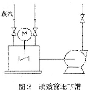 將(jiang)原(yuan)(yuan)地下(xia)(xia)槽內(nei)設置了(le)2塊隔(ge)板,使(shi)利用(yong)部分的體(ti)積(ji)約為原(yuan)(yuan)來的1/2,并將(jiang)原(yuan)(yuan)地下(xia)(xia)槽內(nei)的攪拌器和堿(jian)液泵去(qu)掉,該增一液下(xia)(xia)泵,在蒸汽管線和液下(xia)(xia)泵出口(kou)回路管線末端各加一45°彎(wan)頭。如圖4所示。