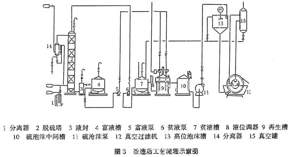 在原(yuan)流(liu)程上增加(jia)了硫(liu)泡沫(mo)(mo)中間槽、硫(liu)泡沫(mo)(mo)泵、真空轉(zhuan)鼓過(guo)濾(lv)(lv)機(ji)及過(guo)濾(lv)(lv)所需的真空罐、濾(lv)(lv)液罐。硫(liu)泡沫(mo)(mo)從再生槽溢流(liu)至硫(liu)泡沫(mo)(mo)中間槽,連(lian)續或(huo)間斷有硫(liu)泡沫(mo)(mo)泵打入高位泡沫(mo)(mo)槽,加(jia)熱分(fen)層(ceng),清液返回系統,底部硫(liu)膏由真空過(guo)濾(lv)(lv)機(ji)進行過(guo)濾(lv)(lv),形成的濾(lv)(lv)餅裝袋處理(li)。