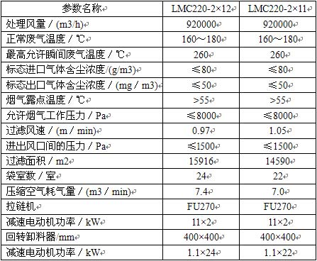 根據標態出口氣體含塵濃度≤50mg/m3并考慮濾袋實際使用壽命及經濟性,國產濾料過濾風速一般不得超過l.0m/min,進口濾袋過濾風速可以稍大于1.0m/min,使用國產濾料設備選型為LMC220-2×12,使用進口濾料設備選型為LMC220-2×11,設備參數見表2。