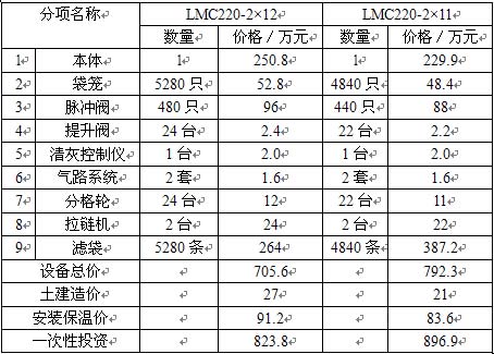 表3 窯尾脈沖袋除塵器投資