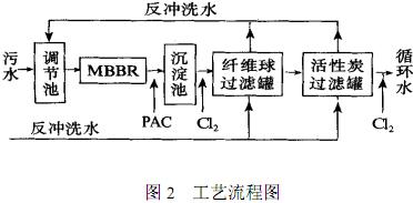 新建的生活污水回用系統的簡要流程見圖2,包括1座調節池,1座MBBR(分為2格),1座輻流式沉淀池,1座中間水池,2座纖維球過濾罐,2座活性炭過濾罐。此外,還包括絮凝劑投加裝置,投氯消毒裝置,伴熱保溫設施等。