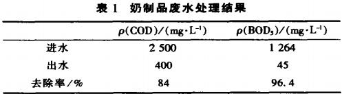 挪威KMT公司早在1989年已對奶制品廠廢水進行小規模試驗后,在挪威南部奧斯陸一奶制品廠建試驗處理廠。廢水水質:pH=5~10,p(COD)=3190ms/L,ρ(BOD5)=1050mg/L,總磷ρ(P)=6.7mg/L,總氮ρ(N)=43mg/L。處理流程:廢水-第一反應器-第二反應器-沉淀池-排放。當反應器停留時間為7h時,COD去除率為85%.停留時間為8h時,COD去除率可達90%。當廢水進水pa值達ll時.經第一反應器生物處理后pH值下降到7左右。試驗成功后該奶制品廠于1993年建成處理廠,處理沖洗容器產生的廢水.廢水量平均90m3/d,最大125m3/d。用泵把廢水送到沉砂池再流入原有調節池,在池中進行預曝氣。用2臺潛水泵(1用1備)從調節池抽水經除油(脂肪)池流入3個串聯的MBBR反應器,反應器的容積分別為33、16、16m3,總容積65m3。池深3.0m。總停留時間為17.3h。載體填充率為水容積的53%。反應器中用不銹鋼多孔管布氣系統,由2臺450m3/h的鼓風機供氣。處理后廢水排人城市污水管。處理廠1993年4月以后運行一直穩定,耗能量平均4.8kW•h/kg[BOD5]。處理結果見表1。