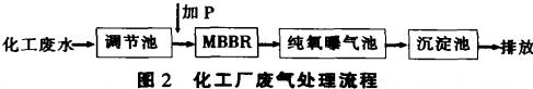 美國一化工廢水處理廠擴建工程,用MBBR法代替老的滴濾池。新建MBBR廢水設施占地面積僅為223m。MBBR出水直接流入純氧活性污泥系統。處理流程見圖2。