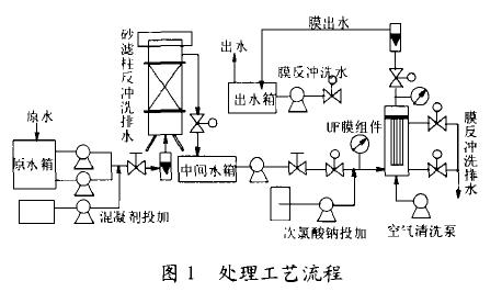 原水由原水箱通過泵進入砂濾柱,混凝劑由計量泵注入原水。混凝劑采用堿式氯化鋁。投加了混凝劑的原水由下而上通過整個砂層,出水進入中間水箱,再由泵進入膜組件,膜過濾水進入出水箱。為了防止微生物在膜表面繁殖,在過濾結束前5min,計量泵自動將次氯酸鈉注入膜組件,投加量為2~3mg/L。