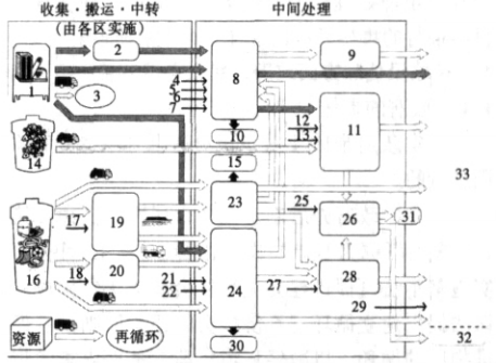 在日本,生活垃圾從住戶至最終處理廠經過收集、搬運、中轉、中間處理、最終處理環節。下面是東京二十三區的垃圾收集處理流程。