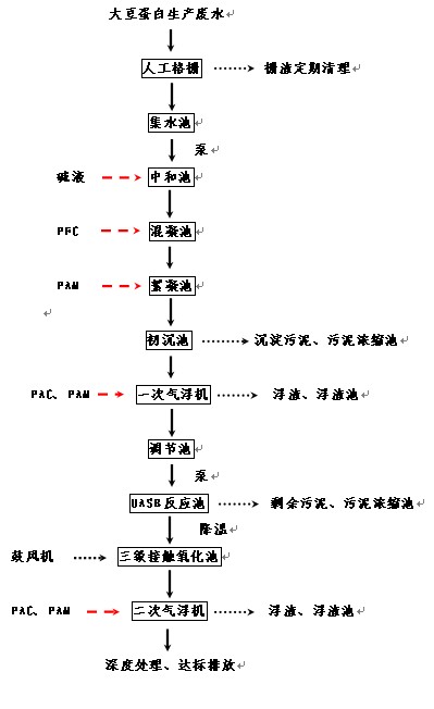 大豆蛋白加工廢水是高濃度有機廢水、高溫、偏酸性、含有植物蛋白質、糖類、鹽類、大量游離性氯離子、硫酸根離子及磷酸鹽等特點。