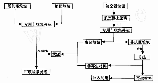 本著垃圾無害化、腐敗性有機物的穩定化、最終處理減量化、資源化、能源化和工廠化的原則,上海浦東國際機場對場內和航空器上的固體廢棄物進行處理流程見下圖。