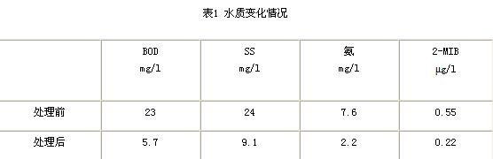 表1列出了幾項污染主要指標,其中BOD反映有機物的含量。SS反映浮游于水中的固體物,造成水體渾濁。由于該地區的市鎮下水設施落后,造成糞便及生活污水排入河道是產生氨的主要原因。2-MIB反映水中藍藻類物質,藍藻類異常繁殖是造成水體腐臭的主要原因。由表1可以看出,通過凈化場后,水質明顯提高,效果十分顯著。