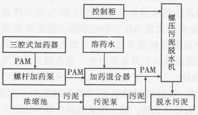 在污泥壓榨區,預脫水的污泥隨著壓力的增加,被進一步擠壓脫水,在較小的壓力下,也可達到較高的脫水能力。部分濾液的回流保證了過濾的最佳效果。污泥脫水流程見圖1。