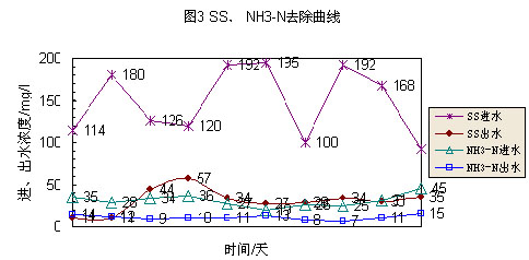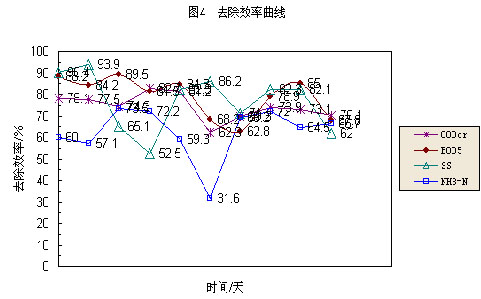 由圖2、圖3、圖4可知:CODcr進水(shui)(shui)(shui)(shui)濃(nong)(nong)度(du)(du)(du)(du)范圍(wei)(wei)(wei)(wei)值(zhi)(zhi)為227~335mg/L,出(chu)水(shui)(shui)(shui)(shui)濃(nong)(nong)度(du)(du)(du)(du)范圍(wei)(wei)(wei)(wei)值(zhi)(zhi)為48~97mg/L,平均去(qu)除率(lv)為74.3%;BOD5進水(shui)(shui)(shui)(shui)濃(nong)(nong)度(du)(du)(du)(du)范圍(wei)(wei)(wei)(wei)值(zhi)(zhi)為85~133mg/L,出(chu)水(shui)(shui)(shui)(shui)濃(nong)(nong)度(du)(du)(du)(du)范圍(wei)(wei)(wei)(wei)值(zhi)(zhi)為11.2~29.3mg/L,平均去(qu)除率(lv)為79.1%;SS進水(shui)(shui)(shui)(shui)濃(nong)(nong)度(du)(du)(du)(du)范圍(wei)(wei)(wei)(wei)值(zhi)(zhi)為92~195mg/L,出(chu)水(shui)(shui)(shui)(shui)濃(nong)(nong)度(du)(du)(du)(du)范圍(wei)(wei)(wei)(wei)值(zhi)(zhi)為11~57mg/L,平均去(qu)除率(lv)為76.8%;NH3-N進水(shui)(shui)(shui)(shui)濃(nong)(nong)度(du)(du)(du)(du)范圍(wei)(wei)(wei)(wei)值(zhi)(zhi)為19~45mg/L,出(chu)水(shui)(shui)(shui)(shui)濃(nong)(nong)度(du)(du)(du)(du)范圍(wei)(wei)(wei)(wei)值(zhi)(zhi)為7~15mg/L,平均去(qu)除率(lv)為62.6%。