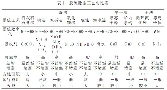 脫硫除塵工藝比較選擇如表 1 所示。