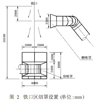 (2)合理設置排煙罩。開、堵鐵口產生的煙塵具有煙氣溫度較高、煙氣量大和噴射力強等特點 ,為了有效捕集煙塵 ,在靠風口平臺外沿布置鐵口頂吸罩(圖 2) ,通過計算 ,確定頂吸罩外沿距鐵口約 10.1m,罩口尺寸為 4m × 4m,以達到最佳效果。設計上將其分割為3部分 ,前罩規格為:4m× 2.4 m,固定在平臺風口上;后罩分為兩部分 ,規格各為: 2m ×1.6 m,平放在風口平臺上 ,可由叉車移走。同時在開口機、泥炮機的對側設一個 2.3 m ×1m的側吸罩 ,一方面對鐵口產生的煙氣起到封擋作用 ,另一方面還可以配合頂吸罩抽排煙塵。頂吸罩、側吸罩的內表面均噴涂耐火材料 ,以防止罩體高溫烘烤變形。