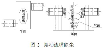 擺動流嘴除塵是僅次于鐵口區的第二大污染區。鐵水從高處落下 ,沖刷擺動流嘴內部的耐材從而產生大量煙塵。寶鋼其他高爐采用單一吸風口 ,相對于較開放的除塵空間 ,吸力的有效范圍小 ,除塵效果差 ,罐車內渣多時 ,煙塵有冒出現象。針對這種情況 , 4#高爐擺動流嘴采取兩側對角抽吸的方式。這種新型抽風方式的特點是利用氣流的對角錯位流動形成類似于“龍卷風” 的氣流(見圖 3),下部的煙塵由于負壓 ,被氣流吸上來 ,最終進入除塵管道。兩個吸口不僅沒有相互干擾 ,還相輔相成 ,達到強化抽風效果。