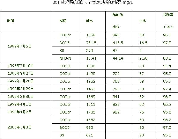 從表中數據可見,宰雞廢水經本系統處理,COD去除率為94.4%~97.5%,大多在95%以上,出水COD均低于75mg/L;BOD去除率為97.5%以上;SS 去除率為95.5%以上;NH3-N去除率為83.1%。運行表明,pH值為9.60的堿性廢水進入隔油沉淀池后,其出水pH值降至6.96,產生酸化作用,這可能也是隔油常常池去除率高的一個原因。而此過程中,NH3-N明顯升高,證實了確已發生生化反應。