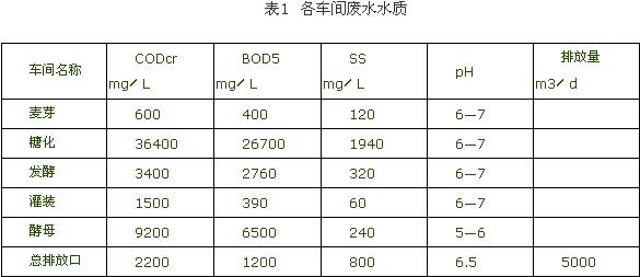 廢水主要來自麥芽、糖化、發酵、灌裝及生產用冷卻廢水等,各車間廢水水質見表1。