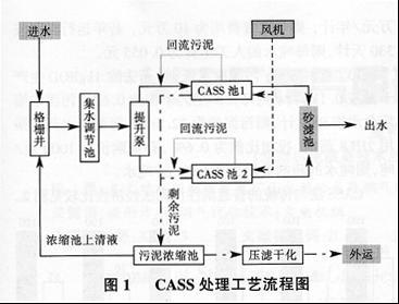 廢水經格柵除去粗大雜物后,進入集水池內,經水泵提升進入CASS反應池中,使廢水中的大部分污染物在池中得到降解和去除。廢水在這里得到生化處理,處理后的廢水排入砂濾池,經過濾消毒后排人細河。CASS反應的剩余污泥排人濃縮池中,經濃縮后進入帶式壓濾機脫水,脫水后的干污泥外運,壓濾機濾出水與濃縮池上清液返回集水池內。工藝流程見圖1。