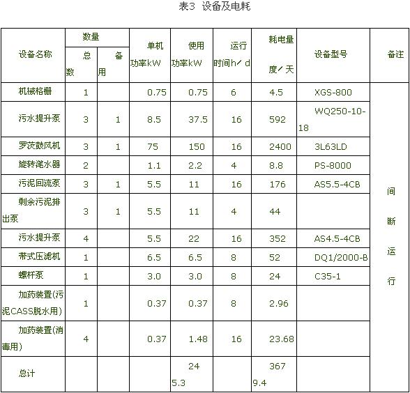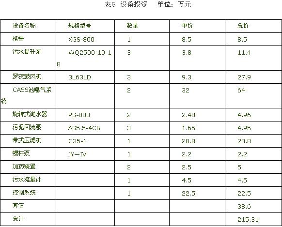 (1)電費:從表3可見電耗為3679.4度/天,電價以0.6元/度計,按設計處理能力5000噸/天計,則噸耗電費用為:3679.4×0.6/5000=0.44元/噸。