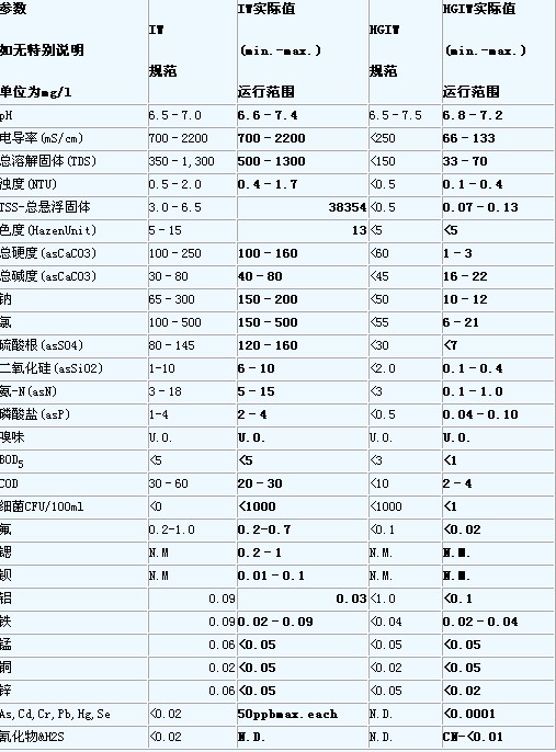 RO產品水(shui)水(shui)質(zhi)始終符合高級(ji)工業用水(shui)(HGIW)的技術(shu)規范(fan)。見(jian)下表“工業用水(shui)(IW)和高級(ji)工業用水(shui)(HGIW)的實(shi)際值(zhi)及規范(fan)值(zhi)的比較(jiao)”。
