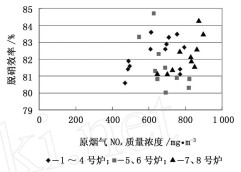 高井熱電廠 1~8號爐原煙氣的 NOx 濃度和 SCR系統脫硝效率檢測結果見圖 2。本文 NOx 、 SO2、 氨的質量濃度值均為標準狀態干煙氣、 氧分為6%狀態下的數值。