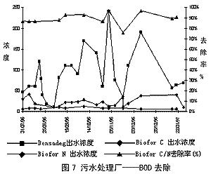 圖7表明了去除有機物濾池和硝化濾池關于BOD去除的運行狀況。從高負荷澄清池出來的污水BOD濃度也原污水的污染物濃度趨勢相一致,其中有一個頂峰,而從去除有機物濾池出來的污水的濃度減少的相當多,并且出水穩定。這可由圖中峰值比較平穩可以看出,而硝化濾池對BOD的去除率是相當低的,在此階段,BAFF污水廠的BOD平均去除率為89%。