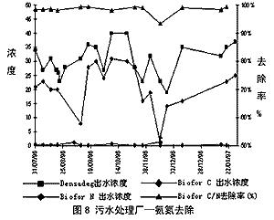 關于氨氮的去除,圖8清楚的表明氨氮的去除主要在生物硝化濾池中進行。從高負荷澄清池和去除有機物濾池出來的污水中氨氮的濃度仍然相當高,而從硝化濾池中獲得的資料表明出水中氨氮的濃度相當的低并且很穩定。在這個階段,氨氮的去除率達到98%。
