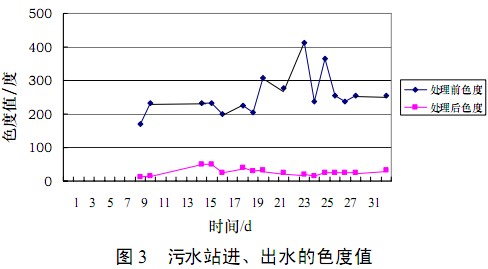 從圖 2 和圖 3 中的 CODcr 和色度變化曲線中可以看出,盡管原水的變化較大,但高效復式曝氣池的出水在調試過程中始終比較平緩,這不僅是由于調節池小,高效復式曝氣池承擔了部分水質水量的調節功能,也表明高效復式曝氣池的緩沖能力較強,它對 CODcr 和色度的去除率始終維持在 40%和 70%左右。 調試過程中,沉淀池中的污泥,除少量供污泥處理系統試運行外,其他全部回流到生化處理系統,整個調試期間,近乎沒有最終污泥產生。