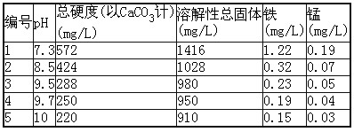 在燒杯內用Ca(OH)2溶液把原水調至不同的pH值,做絮凝沉淀試驗,研究其除鐵除錳和降低水的總硬度及溶解性總固體的效果。