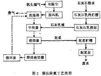 原(yuan)2臺180 m2燒結機機頭煙(yan)(yan)氣采用濕法除氟凈化工(gong)藝(yi)(yi)。煙(yan)(yan)氣經抽(chou)風機引進(jin)114 m2電除塵器(qi)(qi)后,進(jin)入空心(xin)洗滌(di)塔,洗滌(di)去除氟和(he)二氧化硫及煙(yan)(yan)塵等有害成(cheng)分,凈化后的煙(yan)(yan)氣經由120 m煙(yan)(yan)囪排放。洗滌(di)煙(yan)(yan)氣后的酸性(xing)廢液經中(zhong)和(he)器(qi)(qi)用輕燒自云石(shi)乳(ru)液進(jin)行中(zhong)和(he),然(ran)后進(jin)入澄清(qing)器(qi)(qi),澄清(qing)液流入澄清(qing)液受槽,用循(xun)環泵(beng)汲至洗滌(di)塔循(xun)環使用,沉(chen)淀污泥進(jin)入泥漿受槽由泥漿泵(beng)送(song)至選礦(kuang)廠(chang)尾礦(kuang)庫集(ji)中(zhong)處(chu)理(li)。其(qi)工(gong)藝(yi)(yi)流程及產物(wu)環節見圖2。