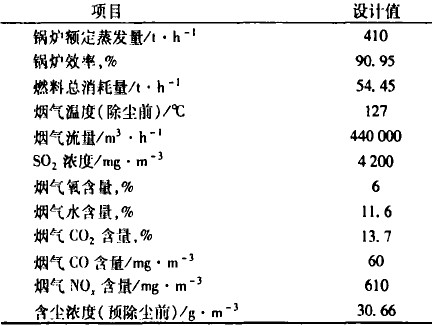 齊魯石化公司熱電(dian)廠燃用煤種為(wei)山東(dong)山西混合(he)貧(pin)煤,設計單臺(tai)鍋爐(lu)耗煤54.45t/h,人爐(lu)煤含(han)硫量1.5%。脫(tuo)硫除塵島(dao)人口煙氣參數見(jian)(jian)圖(tu)11。脫(tuo)硫除塵(按單臺(tai)計)具體設計參數見(jian)(jian)圖(tu)12。