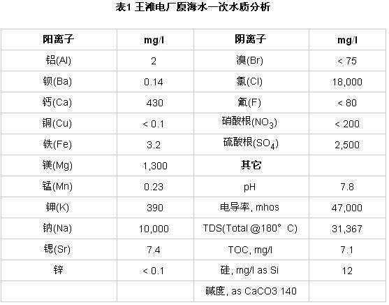 表1 王灘電廠原海水一次水質分析
