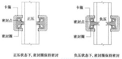 因此必須采用專門設計的抗負壓的溝槽管件,在正負壓不同狀態下,通過不同的密封點而保證系統的密封性。同時溝槽管件中管頭縫隙還可以消除因熱脹冷縮而產生的管道位移。如下圖所示: