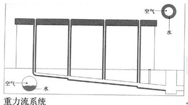 傳統重力流雨水排放系統與虹吸式雨水系統相比管道內雨水流態是不一樣的。在重力流系統中,水沿著立管的管壁流下,中間形成空氣柱,在懸吊管段水依靠重力非滿管水平流動,一般情況下,管材斷面約1/3為水,2/3為空氣。如下圖: