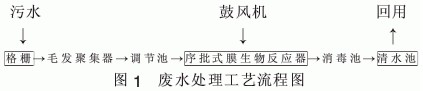 1.處理工藝流程。膜生物反應器(membrane bioreactor, MBR)工藝是高效膜分離技術及生物處理技術組合而成的廢 水生物處理新工藝,是一種高效的水凈化再生技術。采用膜 分離系統代替普通活性污泥法中的二沉池,進行固液分離, 有效地達到了泥水分離的目的。應用膜生物反應器工藝處理 生活污水,其優點突出體現在:對生活污水中的懸浮物、濁 度、細菌和病毒去除率高,可使反應器維持在高濃度活性污 泥狀態下進行,污泥齡長、污泥產生量小,出水水質良好且穩 定,可直接回用,運行管理簡單等。為了確保出水氨氮達標, 本工程采用SBR工藝和傳統膜生物反應器相結合的新工 藝,即序批式膜生物反應器工藝對生活污水進行處理,其工 藝流程如圖1所示。
