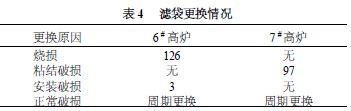 濾(lv)(lv)(lv)袋(dai)(dai)(dai)(dai)(dai)使(shi)用(yong)的(de)(de)好(hao)壞(huai)及壽(shou)命(ming)(ming)(ming)的(de)(de)長(chang)短,對(dui)(dui)除塵(chen)器的(de)(de)運(yun)行狀態(tai)以及凈煤(mei)(mei)氣質量的(de)(de)好(hao)壞(huai)有著(zhu)極大(da)(da)的(de)(de)影響。造成(cheng)濾(lv)(lv)(lv)袋(dai)(dai)(dai)(dai)(dai)破(po)損(sun)的(de)(de)原因很多,主要因素有除塵(chen)器的(de)(de)操作、荒(huang)煤(mei)(mei)氣溫度控制(zhi)、濾(lv)(lv)(lv)袋(dai)(dai)(dai)(dai)(dai)安裝(zhuang)以及濾(lv)(lv)(lv)袋(dai)(dai)(dai)(dai)(dai)本(ben)身質量等原因。從表2 可看出(chu),選用(yong)氟鎂緦針刺(ci)氈濾(lv)(lv)(lv)料(liao),其過濾(lv)(lv)(lv)風速可達到1 - 1. 5 m/ min ,有效地(di)保證(zheng)了(le)(le)濾(lv)(lv)(lv)袋(dai)(dai)(dai)(dai)(dai)的(de)(de)正(zheng)常使(shi)用(yong)壽(shou)命(ming)(ming)(ming)。在(zai)(zai)(zai)運(yun)行過程中,考慮(lv)到濾(lv)(lv)(lv)袋(dai)(dai)(dai)(dai)(dai)破(po)損(sun)部(bu)位大(da)(da)都集中在(zai)(zai)(zai)袋(dai)(dai)(dai)(dai)(dai)口(kou)及袋(dai)(dai)(dai)(dai)(dai)底部(bu)位,因此,在(zai)(zai)(zai)上述兩部(bu)位都設(she)計(ji)了(le)(le)加(jia)強層,以增(zeng)強易(yi)(yi)損(sun)部(bu)位的(de)(de)強度。針對(dui)(dui)噴吹(chui)管在(zai)(zai)(zai)重新安裝(zhuang)或受熱變形時帶(dai)來的(de)(de)噴吹(chui)口(kou)與袋(dai)(dai)(dai)(dai)(dai)口(kou)中心不對(dui)(dui)應,易(yi)(yi)造成(cheng)吹(chui)破(po)袋(dai)(dai)(dai)(dai)(dai)口(kou)的(de)(de)現象,在(zai)(zai)(zai)袋(dai)(dai)(dai)(dai)(dai)口(kou)設(she)計(ji)安裝(zhuang)了(le)(le)袋(dai)(dai)(dai)(dai)(dai)籠保護套(tao),有效地(di)保護并延長(chang)了(le)(le)布袋(dai)(dai)(dai)(dai)(dai)的(de)(de)使(shi)用(yong)壽(shou)命(ming)(ming)(ming)。該系統(tong)投入運(yun)行以來平(ping)穩有效,正(zheng)常使(shi)用(yong)壽(shou)命(ming)(ming)(ming)達到3 年。表4 為除塵(chen)器投入運(yun)行以來的(de)(de)濾(lv)(lv)(lv)袋(dai)(dai)(dai)(dai)(dai)更換情況(kuang)。