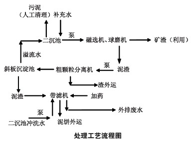 磁選廠生產循環用水主要是磁選機沖洗用水及壓濾機濾布沖洗用水。現有水系統設施主要為水泵房一座,內設兩組水泵,分別供給系統循環用水和沖洗濾布用水;二次沉淀池一個,分三格,容積為15×14×4(m),兼作水泵吸水池;污泥處理部分主要處理磁選機沖洗水廢渣。該系統的主要設施有粗顆粒分離器(兩臺),斜板沉淀池(兩個),帶式壓濾機(一臺),另設有φ3×4(m)加藥罐兩個。斜板沉淀池溢流液流入二次沉淀池(以下簡稱二沉池),壓濾水外排,與無縫廠現有外排水混合,流入七一灌區,匯入漳河。該排水水質呈強堿性。由現無縫廠貯水池補充生產新水,該補充水呈堿性。主要工藝流程如下圖。
