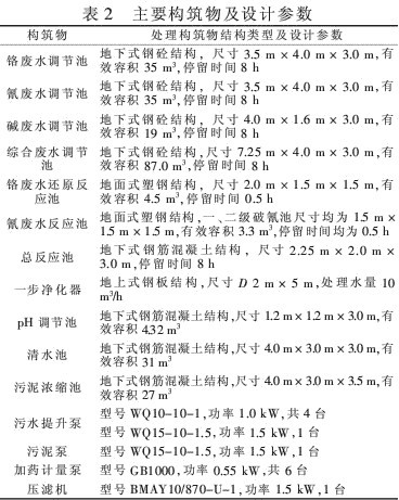 (5)污泥處理。濃縮池內污泥經板框壓濾機脫水,風干后出售給廣東某金屬冶煉廠對污泥中貴重金屬進行提煉,使污泥作為下游產業的原料有效利用,經檢測污泥中主要重金屬質量分數(g/kg):總鉻6.28、總鎳2.21、總銅9.48。濃縮池上清液則回流至含鉻廢水調節池,進入下一批次處理。