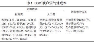 50m3聯戶沼氣池建池成本約為8271元,運行維護成本為170元/年,詳見表1。