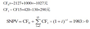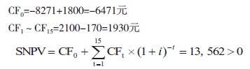 根據調研得知,沼氣池壽命為15年,另設折現率為 5% ,設CFt為第t年的現金流,則: